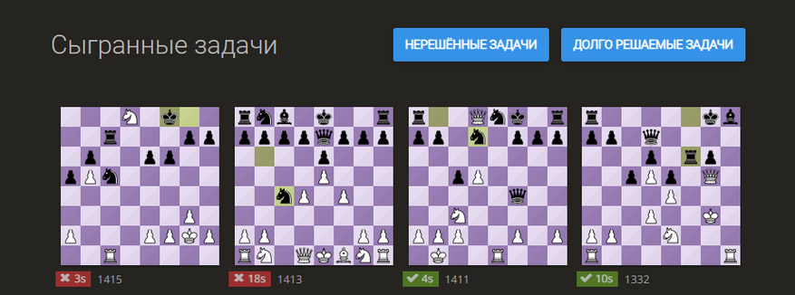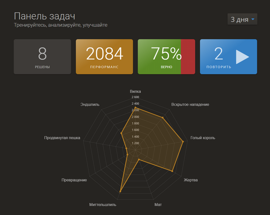 В Lichess есть небольшой раздел, который часто обходят стороной, — «Панель задач». Здесь игроку предоставлена возможность увидеть свои сильные и слабые стороны и, что самое главное, повторить задачи, сделанные с ошибками. Это прекрасная возможность, которая позволяет следить за собственным ростом на практике.